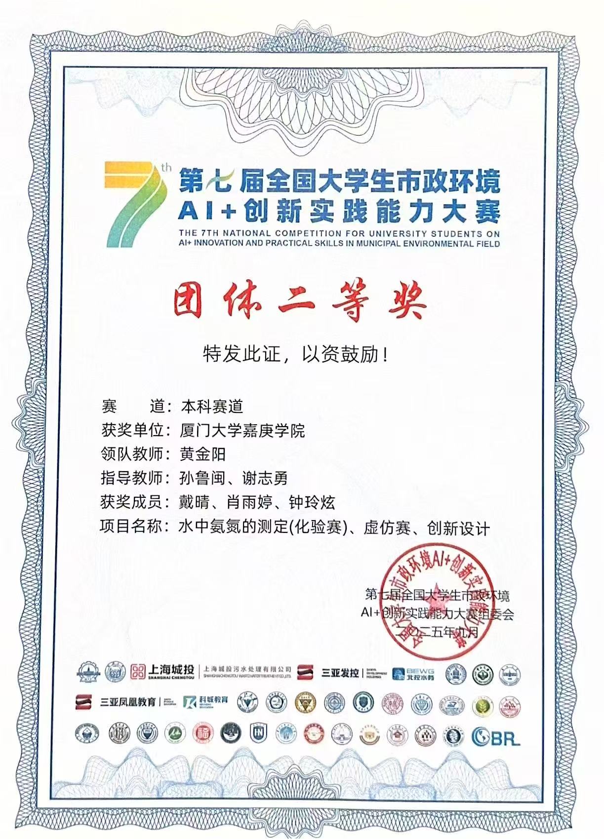 9月21日,第七届全国大学生市政环境AI+类创新实践能力大赛全国总决赛圆满落幕。学院戴晴、肖雨婷、钟玲炫三位同学组成的团队在比赛中表现出色,斩获团体二等奖。同时,团队的指导老师孙鲁闽和谢志勇凭借出色的指导工作,荣获优秀指导教师奖。
