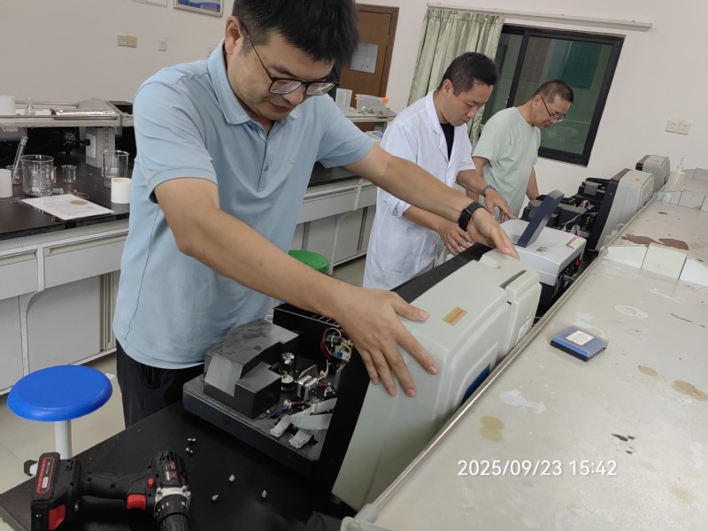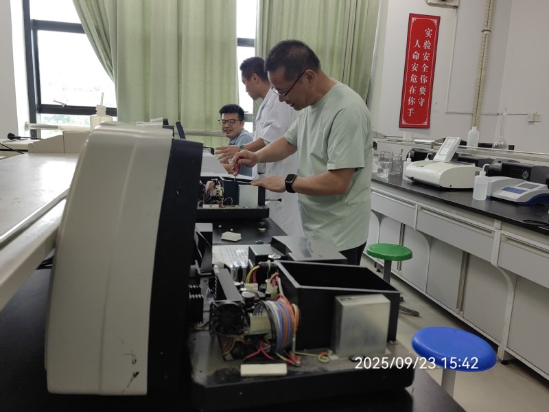9月23日,生化主楼608实验室里,空气静谧如常,唯有精密仪器低鸣运转。实验台上,一台台分光光度计的舱门开启,环境科学与工程学院实验中心主任黄强正带领几位党员教师俯身调试光路,对分光光度计进行常规体检,并更换氘灯、钨灯等器件。
