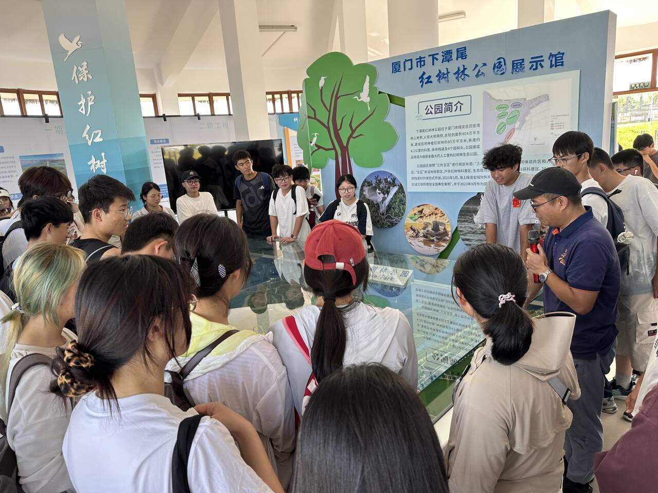 随后,师生走进金砖会议碳中和林。陈慧杰老师介绍,为抵消2017年金砖国家领导人厦门会晤期间的碳排放,在下潭围湿地公园造林面积580亩,实现碳中和年限为20年。造林树种为秋茄、桐花树、白骨壤等珍贵红树树种,兼具生态与景观功能。王鸿辉老师指出,这片树林不仅是碳汇载体,也发挥着涵养水源、净化空气与保护生物多样性的多重作用。