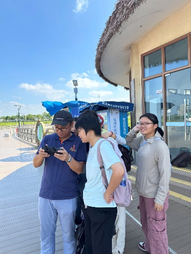 在红树林观景平台,陈慧杰老师讲解了蓝碳原理与七种红树林树种特征,陈斌老师介绍了牡蛎壳生态围堰的技术与生态价值,赖凤娇老师则补充了种植红树以抵消碳足迹的公众参与机制。