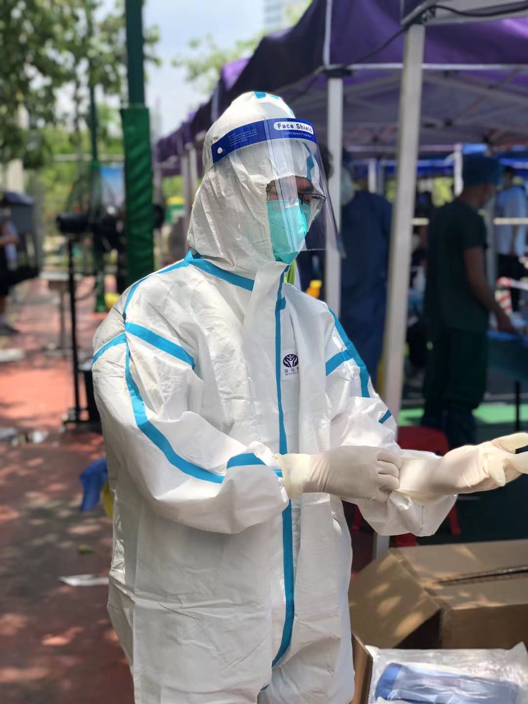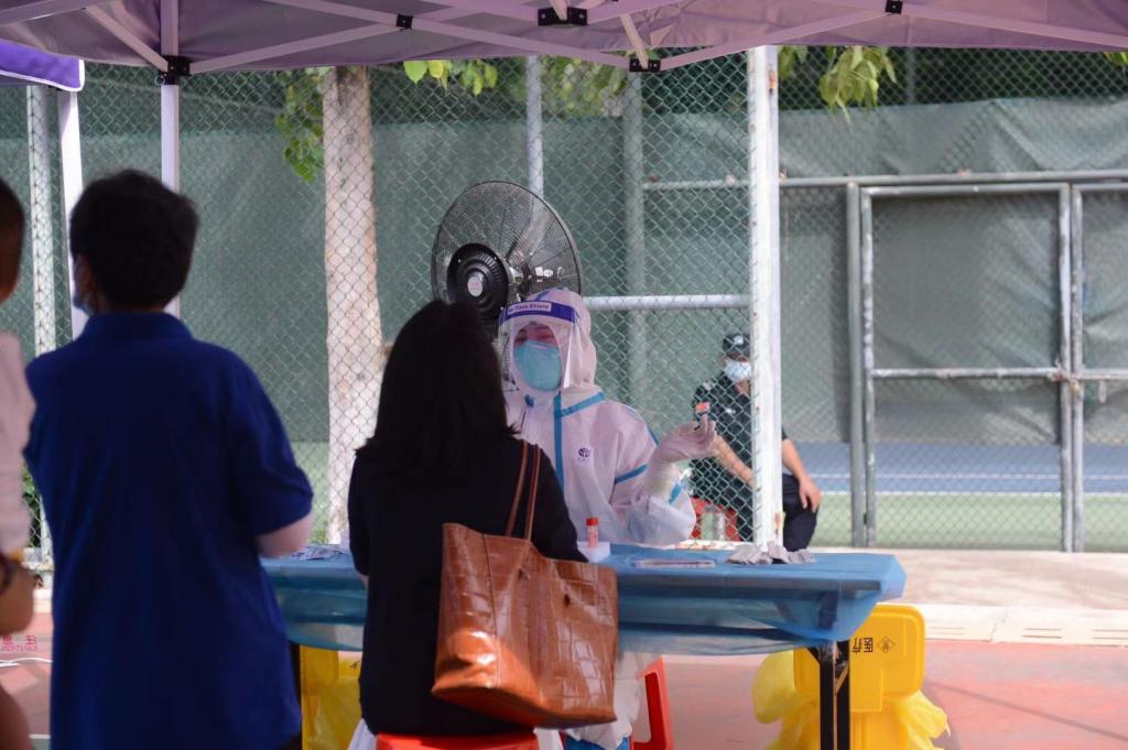 校疫情防控领导小组的工作人员介绍,为确保我校采样工作顺利完成,昨晚接到任务后,后勤处和保卫处的同事半夜12点多赶来布置现场。考虑到今天是夏至,天气炎热,场内全部架起遮阳帐篷、安排了水冷风扇降温,还为采样的医护人员送上冰袋等消暑。