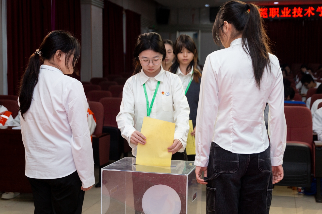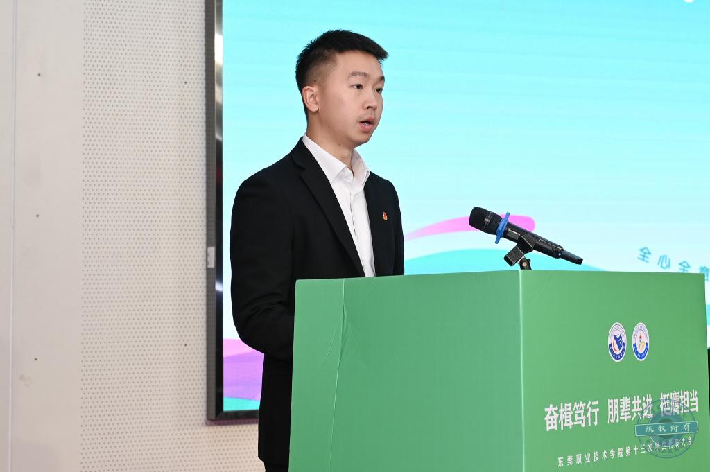 团市委副书记袁俊文在大会上致辞。他充分肯定了东职院学生会近年来在学校党委领导和团委指导下取得的成效,尤其在“百千万工程”实践、“我为同学做实事”项目及十五运会、残特奥会志愿服务中,展现了东职青年的担当与奉献。围绕新征程中学生组织的使命任务,他提出三点希望:一是强化思想政治引领,坚定青年理想信念;二是聚焦服务同学成长,在实习就业等方面提供务实帮助;三是深化自身改革建设,树立阳光清新形象,提升认可度与影响力。最后,他号召全体学生代表和新一届学生会成员把握机遇,挺膺担当,为东莞发展贡献青春力量。