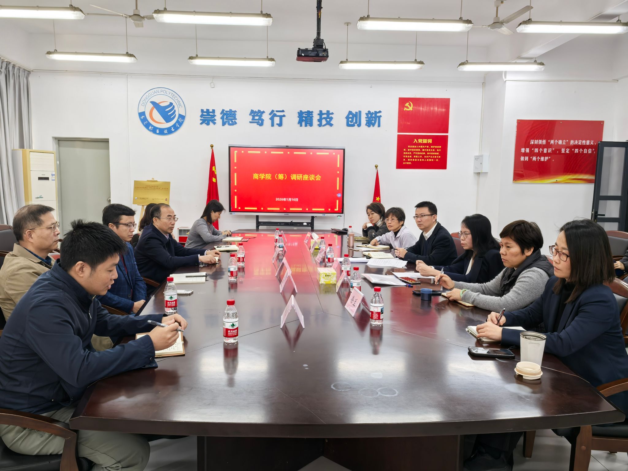 在认真听取汇报和反馈后,贺定修院长对商学院(筹)成立以来各项工作取得的进展与成绩给予了充分肯定,结合学校发展全局与学院实际,他对商学院(筹)下一阶段的工作提出了明确要求:一是围绕学校今年“升本攻坚年”的发展大局,发挥规模与资源优势,深化产教融合,力争在科研、竞赛等方面产出标志性成果;二是对接东莞现代服务业发展需求,优化专业布局,服务地方产业升级;三是注重内涵建设,提升育人质量;四是筑牢安全防线,做好期末与寒假期间师生安全教育管理,保障校园稳定;五是前瞻谋划,科学编制学院“十五五”发展规划;六是常抓师德师风建设,强化节假日关键节点监督,营造清正育人环境。