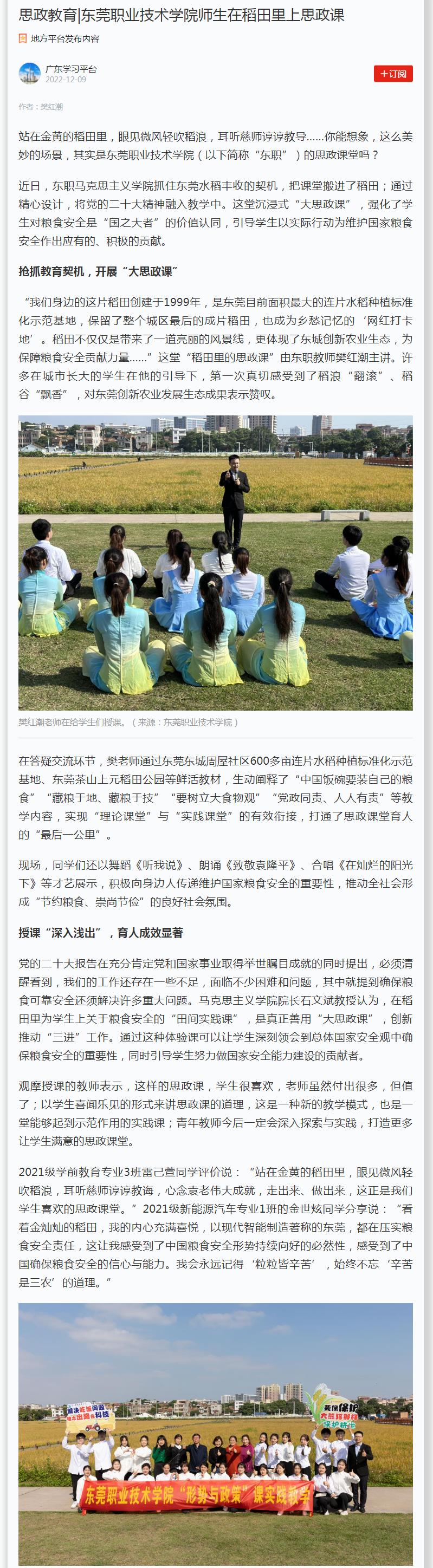 【学习强国】东莞职业技术学院师生在稻田里上思政课
