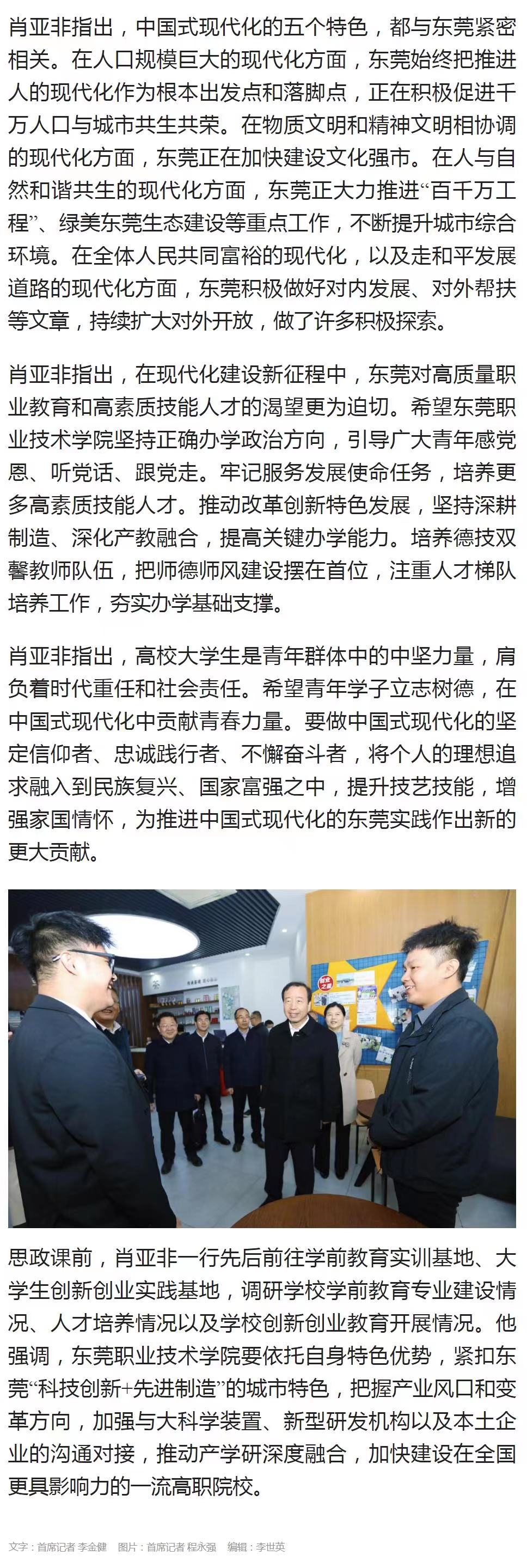 【东莞+】肖亚非到东莞职业技术学院讲授思政课并调研:在推进中国式现代化的时代潮流中更好实现人生价值