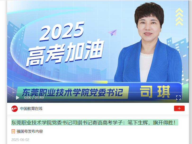 【学习强国】东莞职业技术学院党委书记司琪书记寄语高考学子:笔下生辉,旗开得胜!