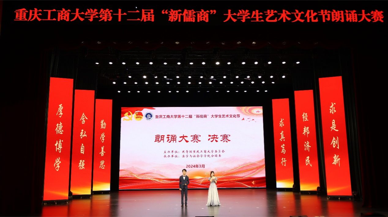 3月29日,由校团委主办、法学与社会学学院分团委承办的第十二届“新儒商”大学生艺术文化节朗诵大赛决赛在我校剧场举行。校党委书记曾维伦,党委常委、副校长李国军,校关工委副主任周航,校团委、法学与社会学学院的主要负责人以及900余名师生代表来到现场观看比赛。重庆市群众艺术馆文化活动部主任莫溦沙,全国社会艺术水平考级主持类朗诵类高级教师周黎,我校语言艺术团指导教师江蕊弘,重庆市语言文字工作委员会委员张彦,我校大学生艺术团指导教师王灿担任决赛评委。